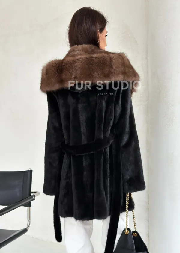 Мех данной шубы аукционная норка, цвет черный. Предлагается в размерах от 42 до 52. Длина модели 80-85 см, что выгодно подчеркивает фигуру девушек. Эта модель идеально подойдет для девушек и женщин, предпочитающих роскошные натуральные меха.