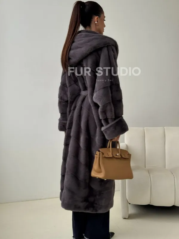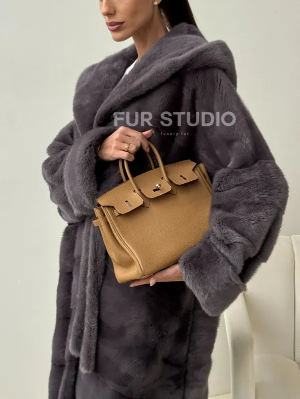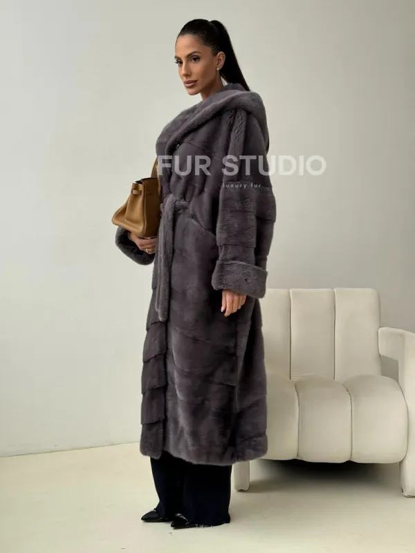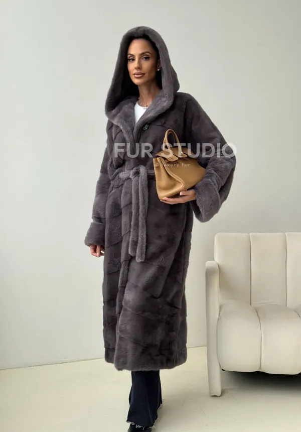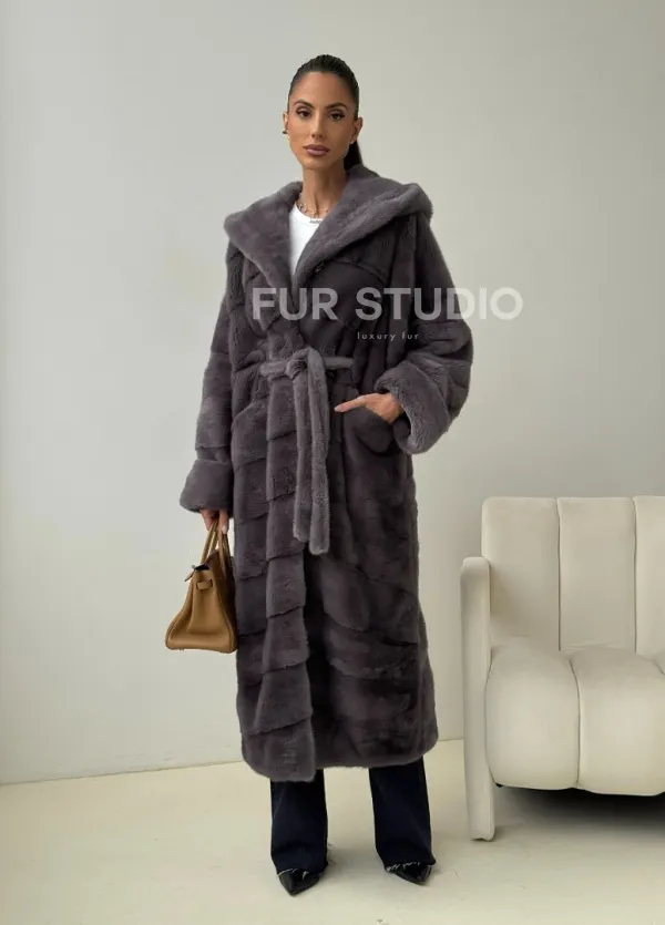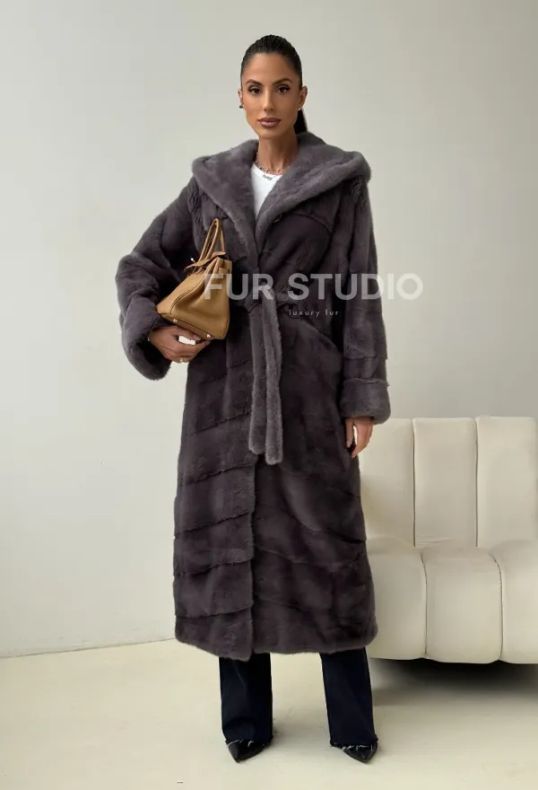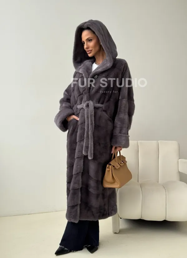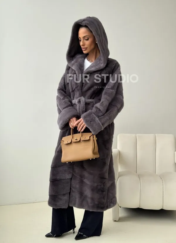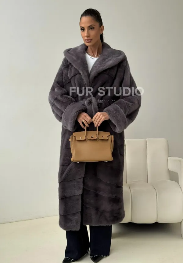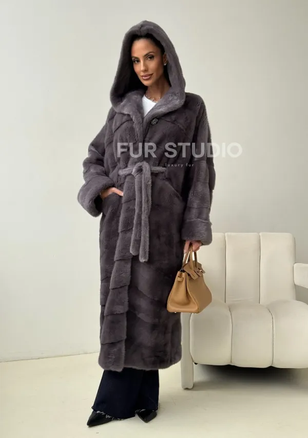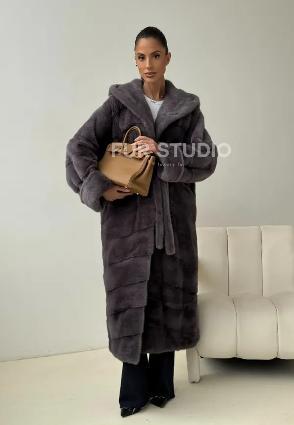 Теплый капюшон защитит волосы от непогоды. Ремень подчеркнет изгибы силуэта. Шуба создана для любительниц приковывать взгляды к своей персоне. Купить удлиненную норковую шубу с капюшоном в цвете графит – выбор настоящих леди