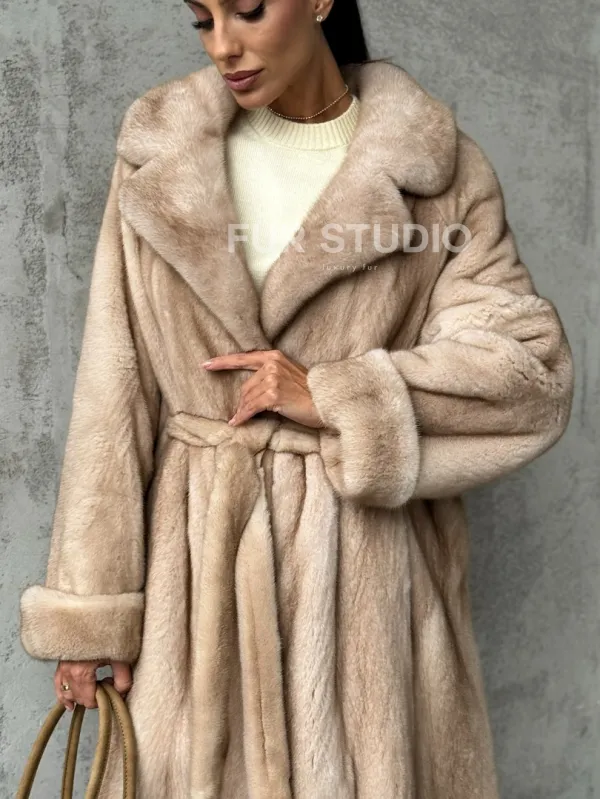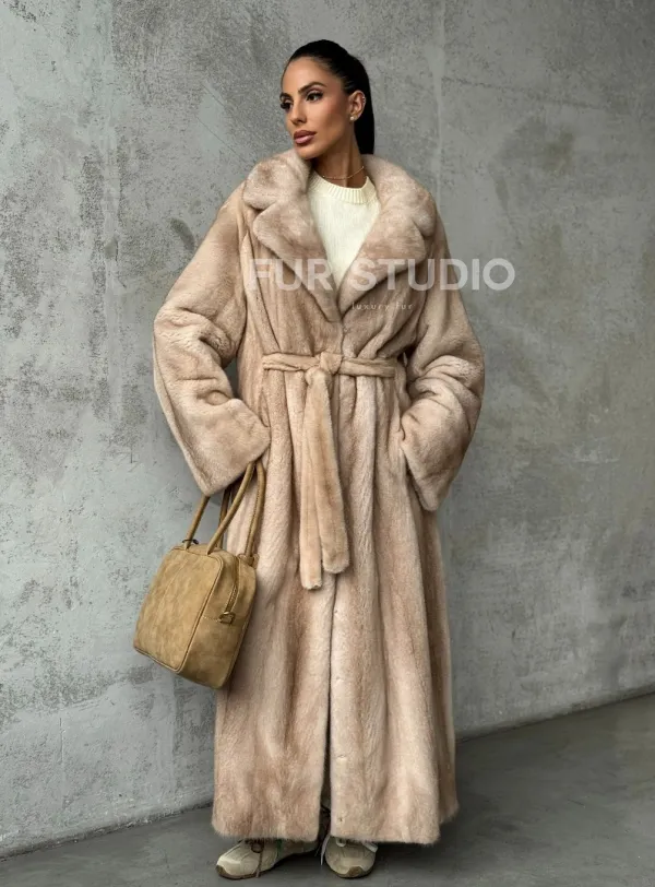Мех данной шубы аукционная норка , цвет бежевый. Предлагается в размерах от 42 до 50. Длина модели 125-130 см, что выгодно подчеркивает фигуру девушек. Эта модель идеально подойдет для девушек и женщин, предпочитающих роскошные натуральные меха.