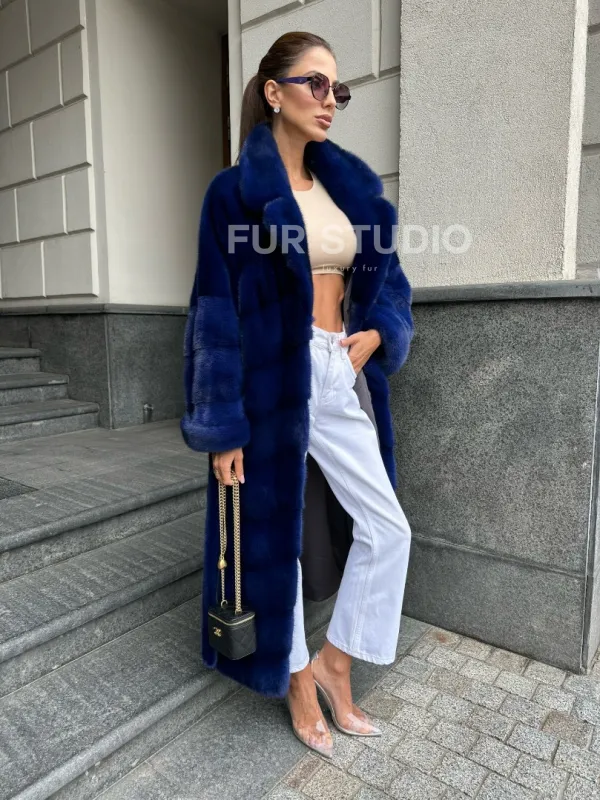 Мех данной шубы аукционная норка, цвет синий. Предлагается в размерах от 42 до 50. Длина модели 115-120 см, что выгодно подчеркивает фигуру девушек. Эта модель идеально подойдет для девушек и женщин, предпочитающих роскошные натуральные меха.