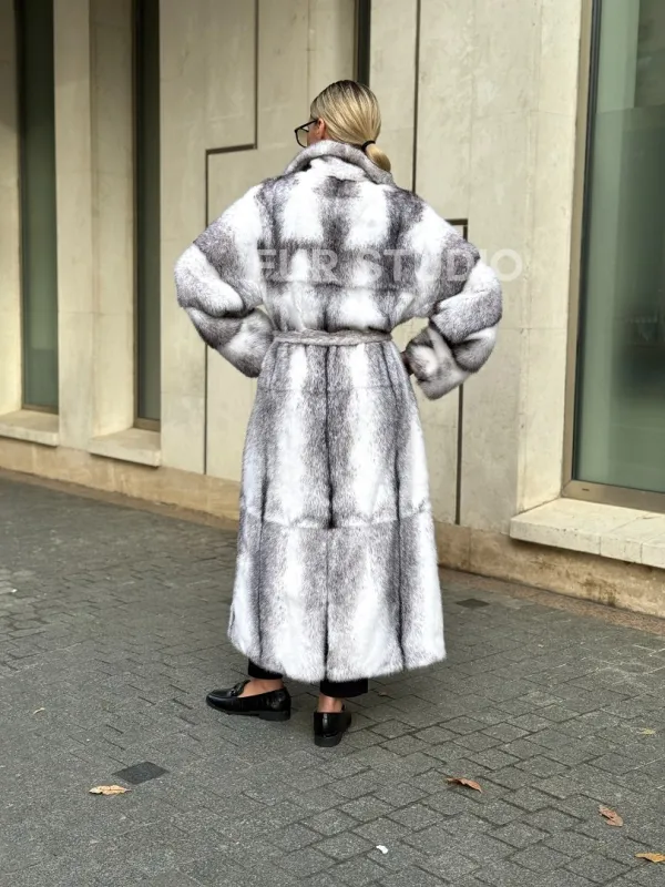 Мех данной шубы аукционная норка, цвет белый. Предлагается в размерах от 42 до 52. Длина модели 125-130 см, что выгодно подчеркивает фигуру девушек. Эта модель идеально подойдет для девушек и женщин, предпочитающих роскошные натуральные меха.