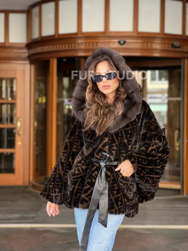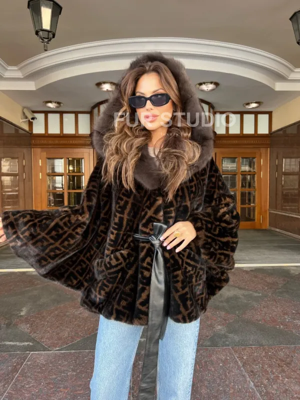Пончо из скандинавской норки с принтом отличная альтернатива шубе. Мягкий мех норки позаботится о комфортной температуре тела в холодное время года. Необычный принт подчеркнет индивидуальность хозяйки. Качество меха гарантирует сохранность изделия в первозданном виде долгие годы. Оригинальный пояс очертит талию и создаст силуэт фигуры «песочные часы».