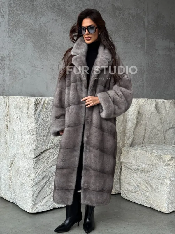 Мех данной шубы аукционная норка, цвет серый. Предлагается в размерах от 42 до 60. Длина модели 115-120 см, что выгодно подчеркивает фигуру девушек. Эта модель идеально подойдет для девушек и женщин, предпочитающих роскошные натуральные меха.