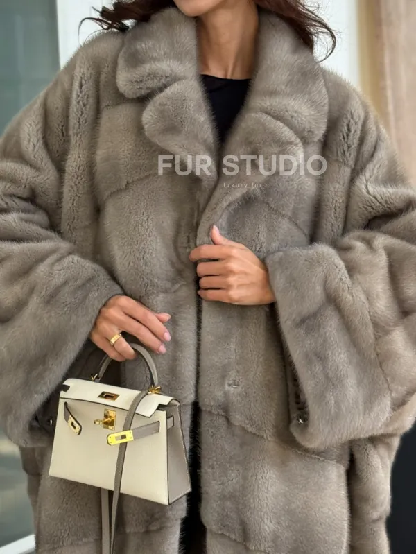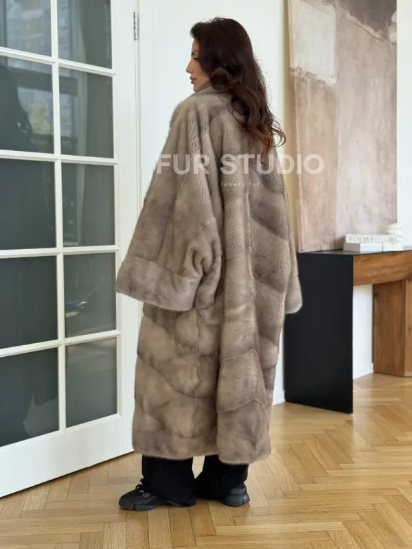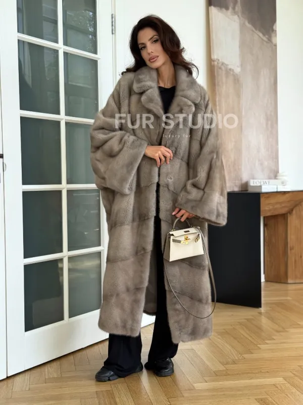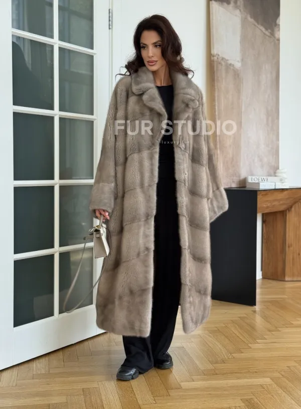 Мех данной шубы аукционная норка, цвет серый. Предлагается в размерах от oversize (42 до 66). Длина модели 120-125 см, что выгодно подчеркивает фигуру девушек. Эта модель идеально подойдет для девушек и женщин, предпочитающих роскошные натуральные меха.