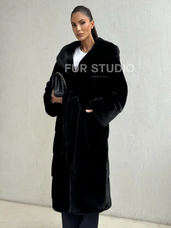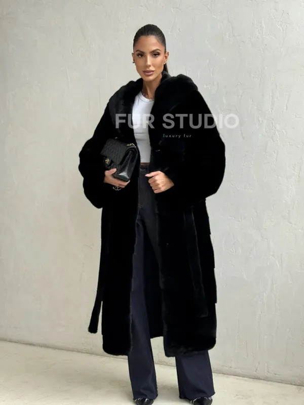 Мех данной шубы норка Blackglama , цвет черный. Предлагается в размерах от 42 до 50. Длина модели 115-120 см, что выгодно подчеркивает фигуру девушек. Эта модель идеально подойдет для девушек и женщин, предпочитающих роскошные натуральные меха.