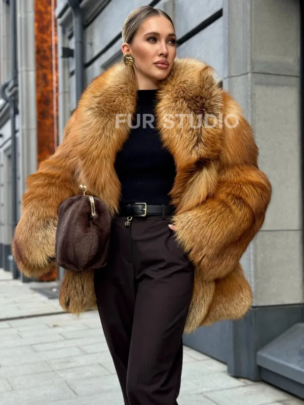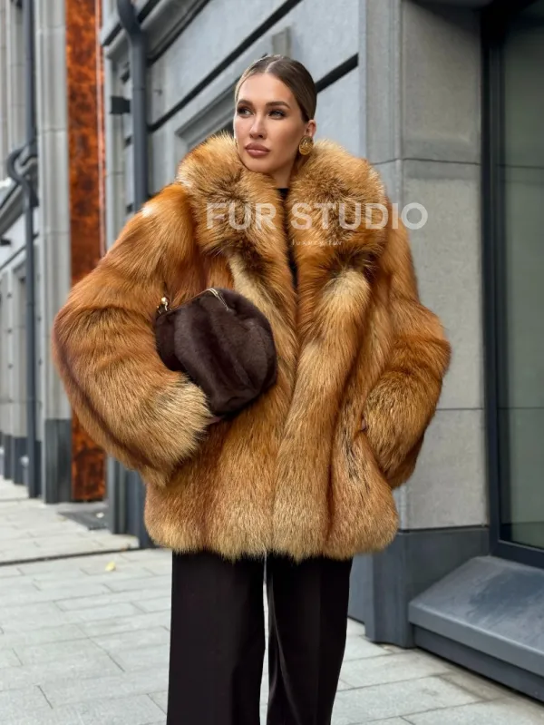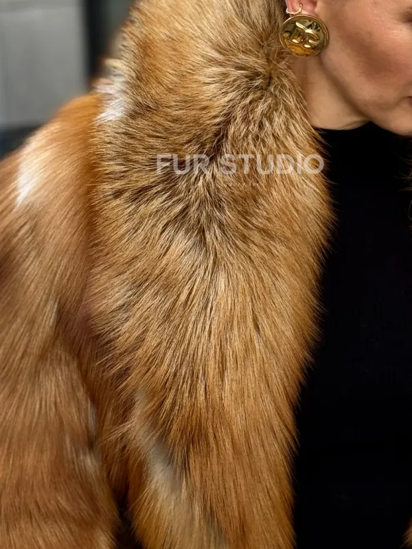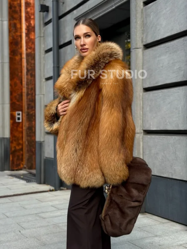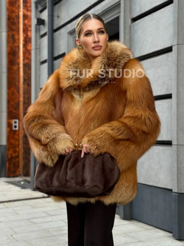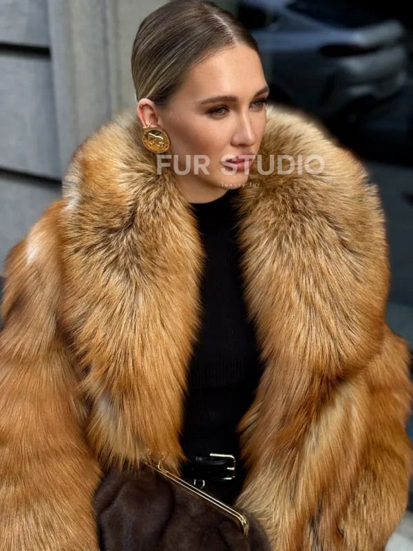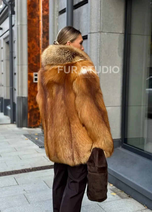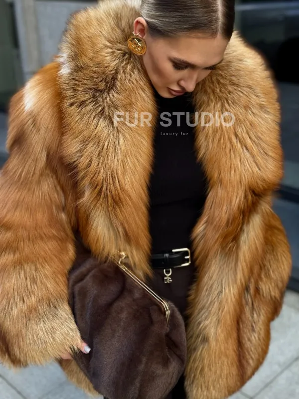 Шуба из лисы огневки отличается следующими особенностями: Объёмный фасон — придаёт образу элегантность и статусность. Широкий воротник — подчёркивает шею и добавляет выразительности. Пышные рукава — создают эффектный силуэт. Натуральная текстура меха — выглядит густой и шелковистой, что говорит о высоком качестве изделия. Тёплый рыжевато-золотистый оттенок — делает шубу заметной и стильной. Образ дополнен: лаконичными тёмными брюками, которые контрастируют с шубой; крупными золотыми серьгами, подчёркивающими утончённость; меховой сумкой в тёмных тонах, гармонирующей с общим стилем. Такой наряд идеально подойдёт для холодного времени года и торжественных случаев.