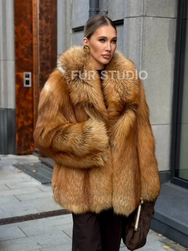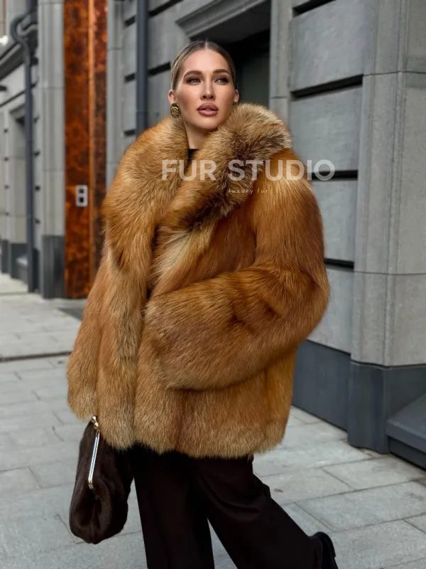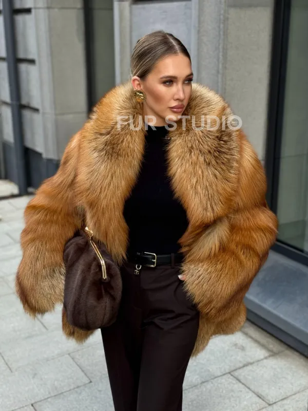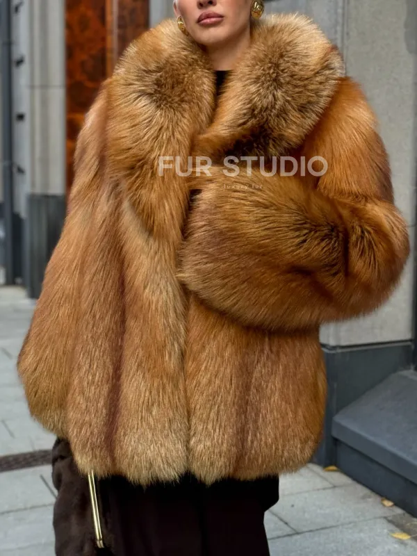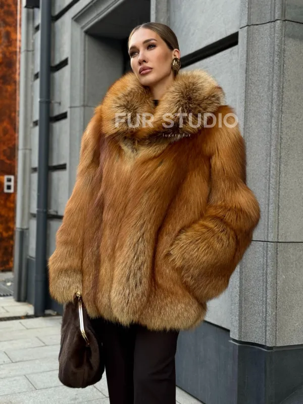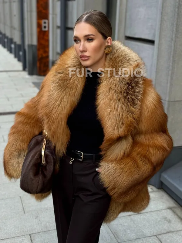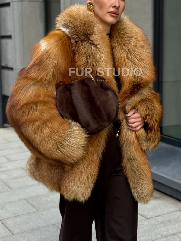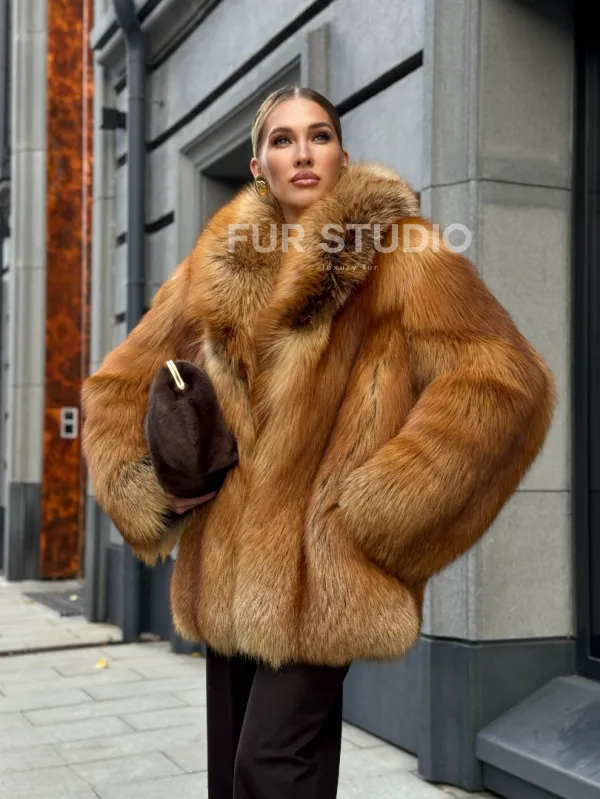 Шуба из лисы огневки отличается следующими особенностями: Объёмный фасон — придаёт образу элегантность и статусность. Широкий воротник — подчёркивает шею и добавляет выразительности. Пышные рукава — создают эффектный силуэт. Натуральная текстура меха — выглядит густой и шелковистой, что говорит о высоком качестве изделия. Тёплый рыжевато-золотистый оттенок — делает шубу заметной и стильной. Образ дополнен: лаконичными тёмными брюками, которые контрастируют с шубой; крупными золотыми серьгами, подчёркивающими утончённость; меховой сумкой в тёмных тонах, гармонирующей с общим стилем. Такой наряд идеально подойдёт для холодного времени года и торжественных случаев.