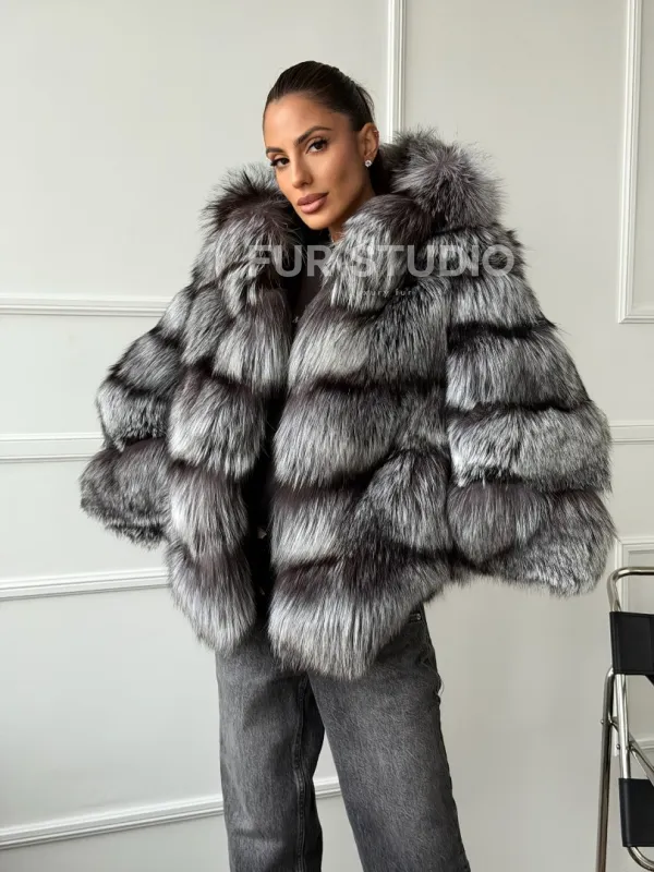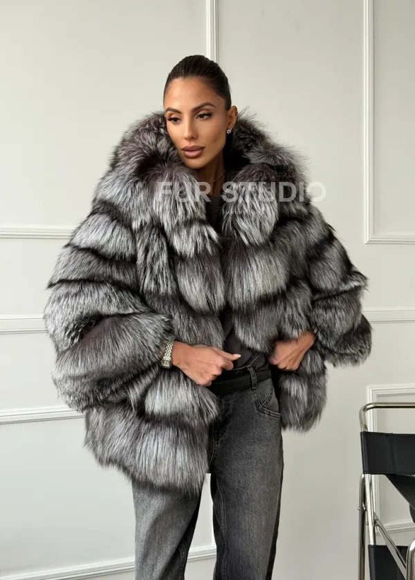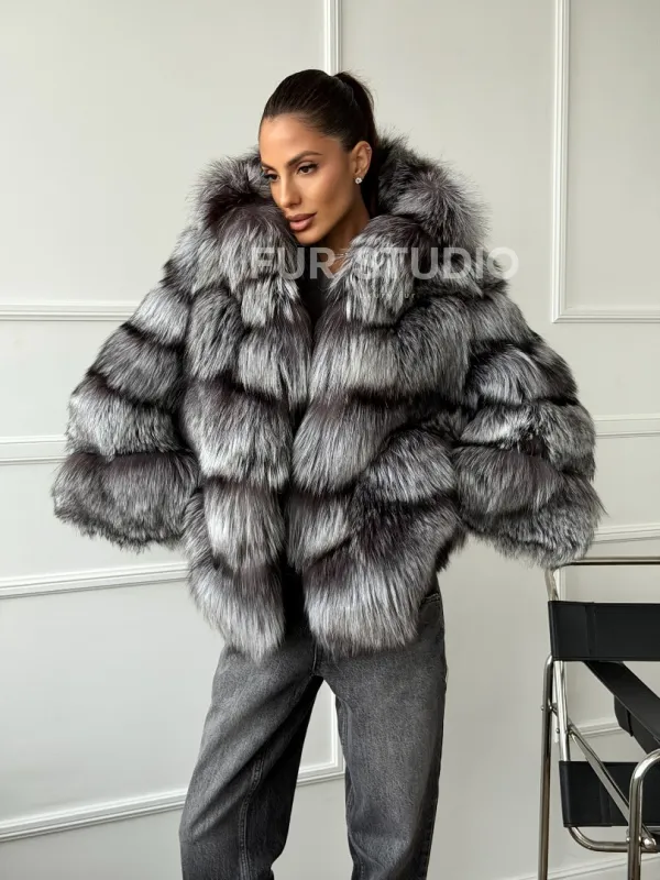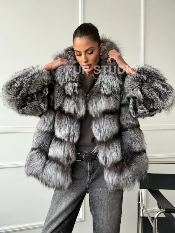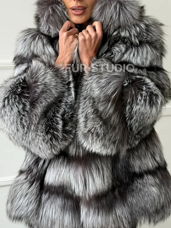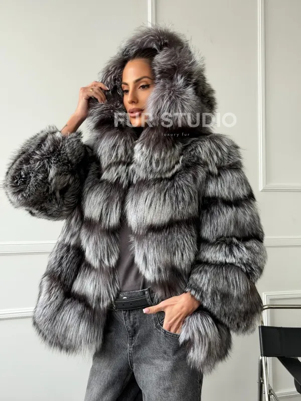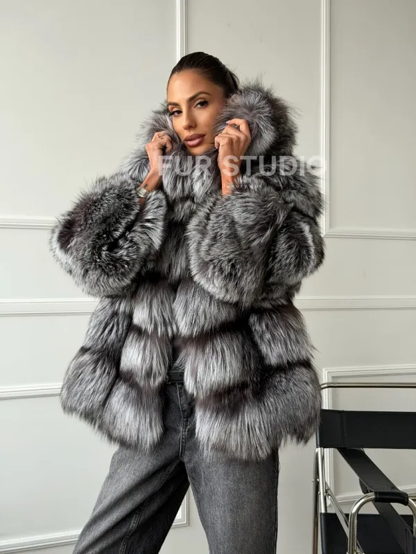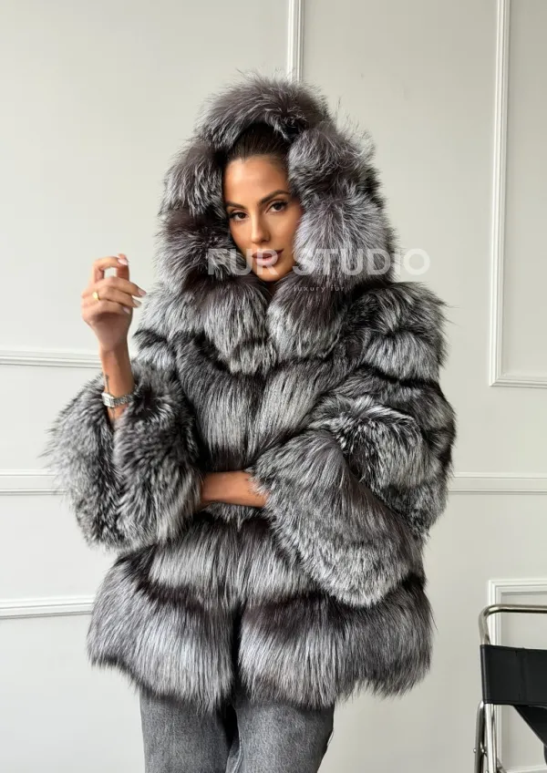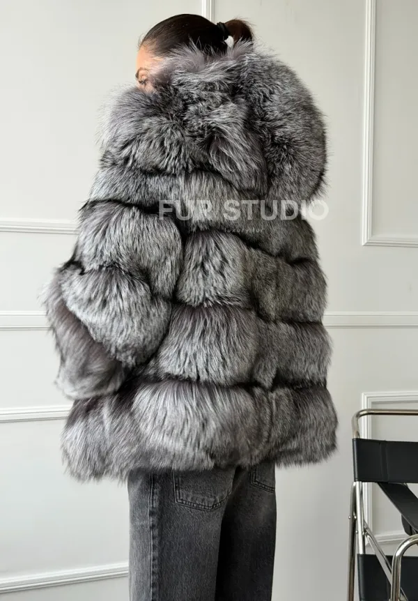 Шуба из меха чернобурки с капюшоном - серая 102663
