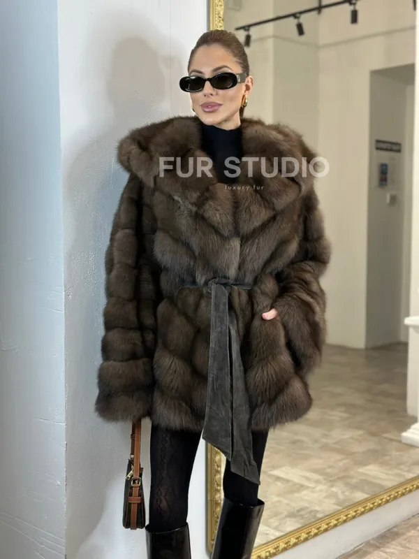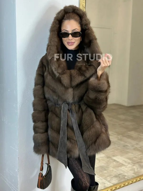 Шуба из меха куницы Dark с капюшоном 100694