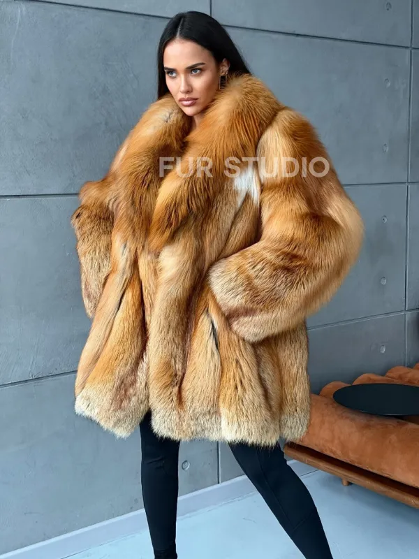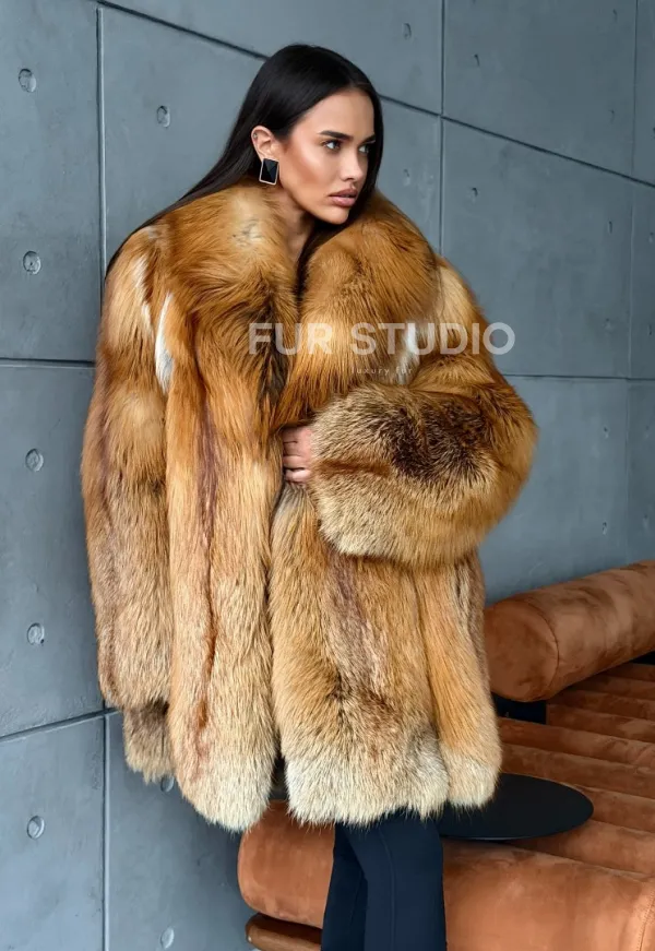 Мех данной шубы лиса, цвет рыжий. Предлагается в размерах от 40 до 52. Длина модели 80-85 см, что выгодно подчеркивает фигуру девушек. Эта модель идеально подойдет для девушек и женщин, предпочитающих роскошные натуральные меха.