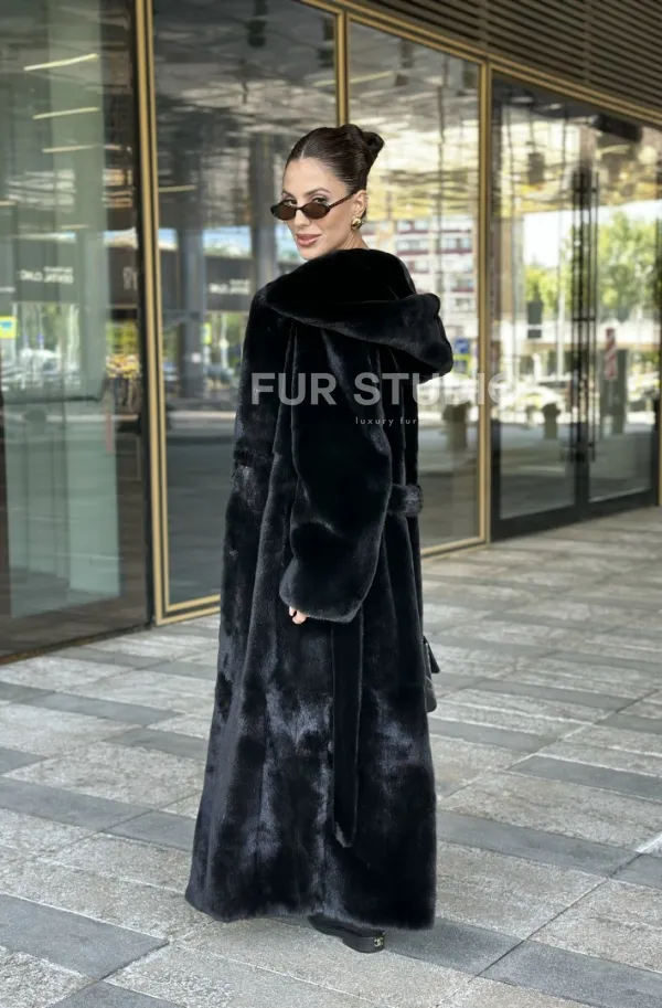 Удлиненная шуба из норки BLACKGLAMA с капюшоном 100910