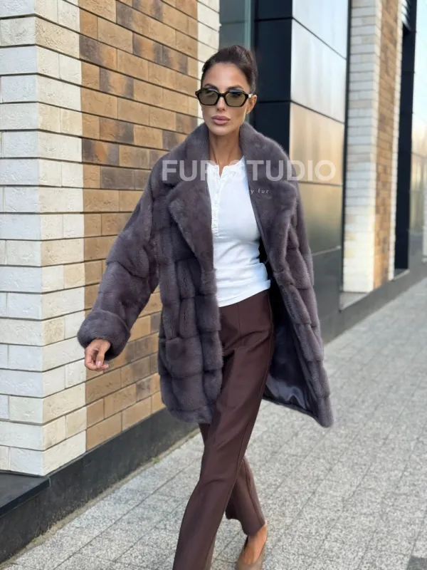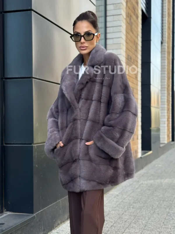 Длинные рукава подчеркнут нежные кисти, а удобные карманы не допустят, чтобы они замерзли. Модель подойдет под базовый гардероб, сочетается с вечерним нарядом. Неординарная сумочка дополнит образ, и вы будете выглядеть, как с обложки журнала. Купить короткую шубу из меха норки с воротником из меха куницы цвет лаванда могут только девушки, которые знают, что хотят от жизни.