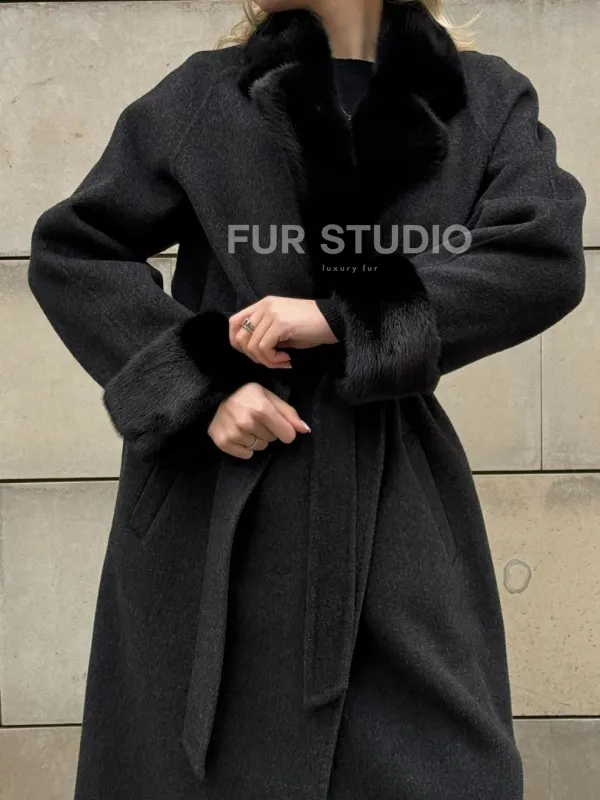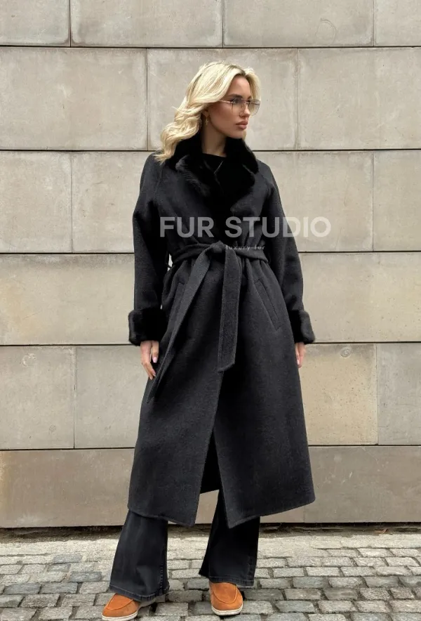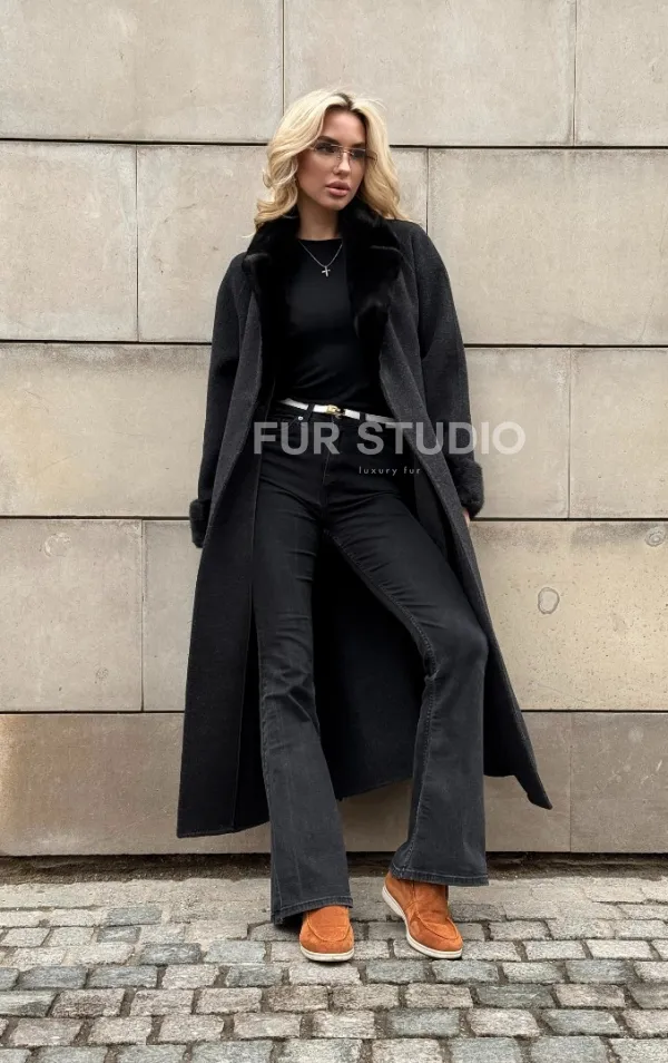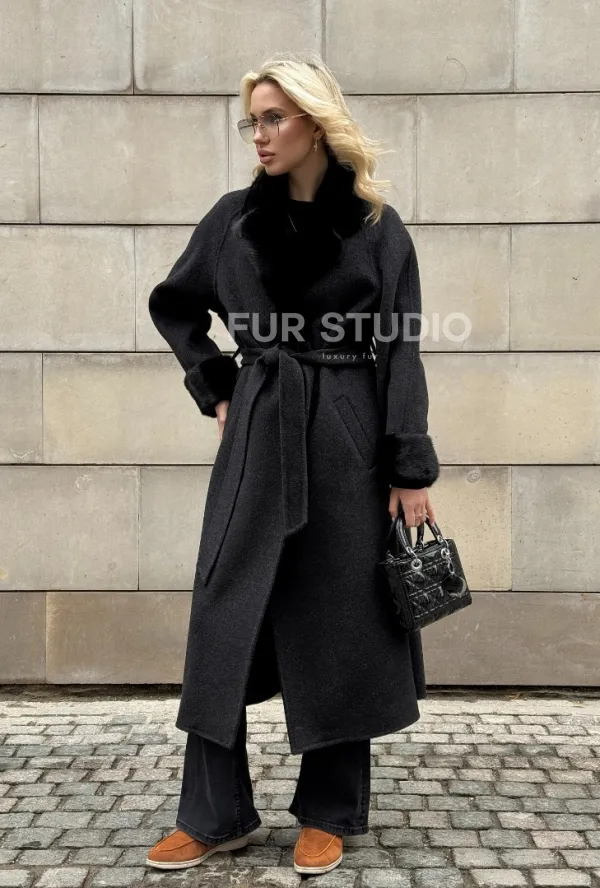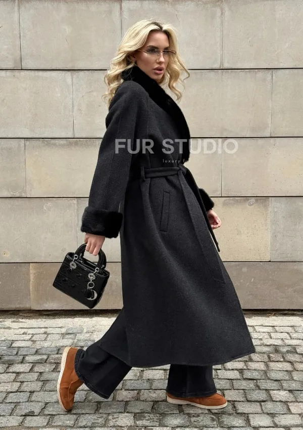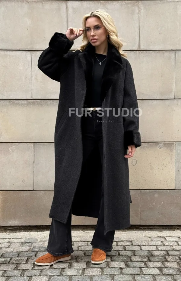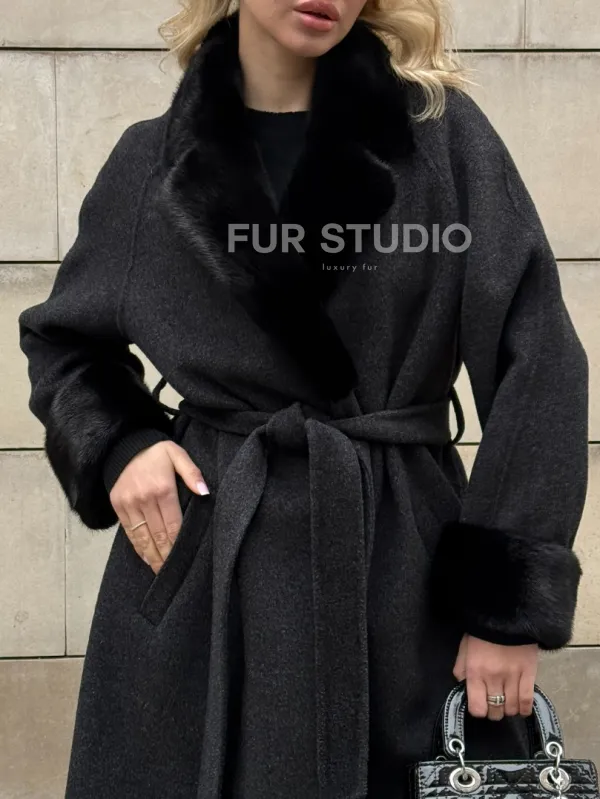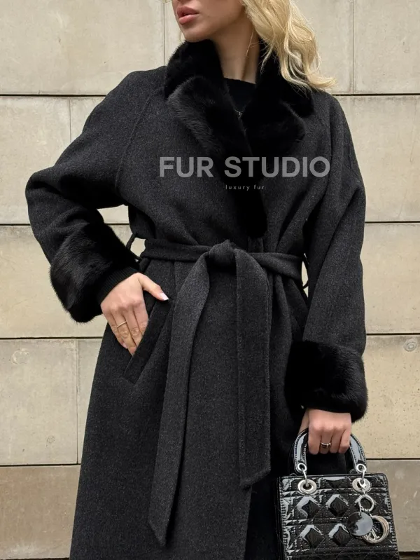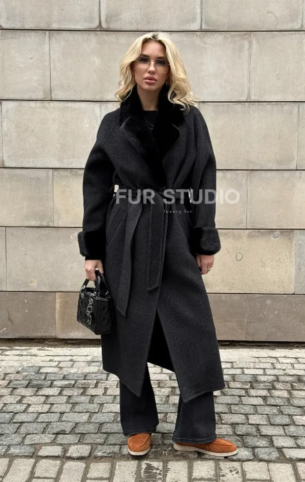 Женское демисезонное шерстяное пальто-халат с отделкой из меха норки 101808